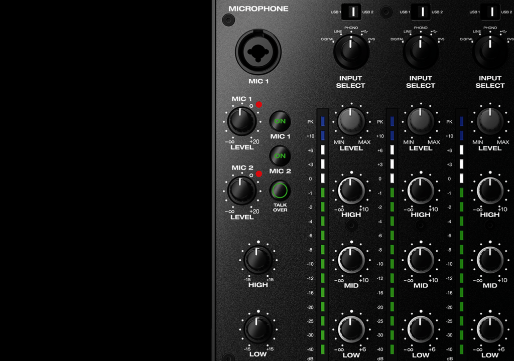 No sacrifice of line faders with 2 independent, EQ/level controlled microphone channels with ‘talkover’. Get Split/Cue headphone monitoring with 1/4″ jack plus minijack inputs